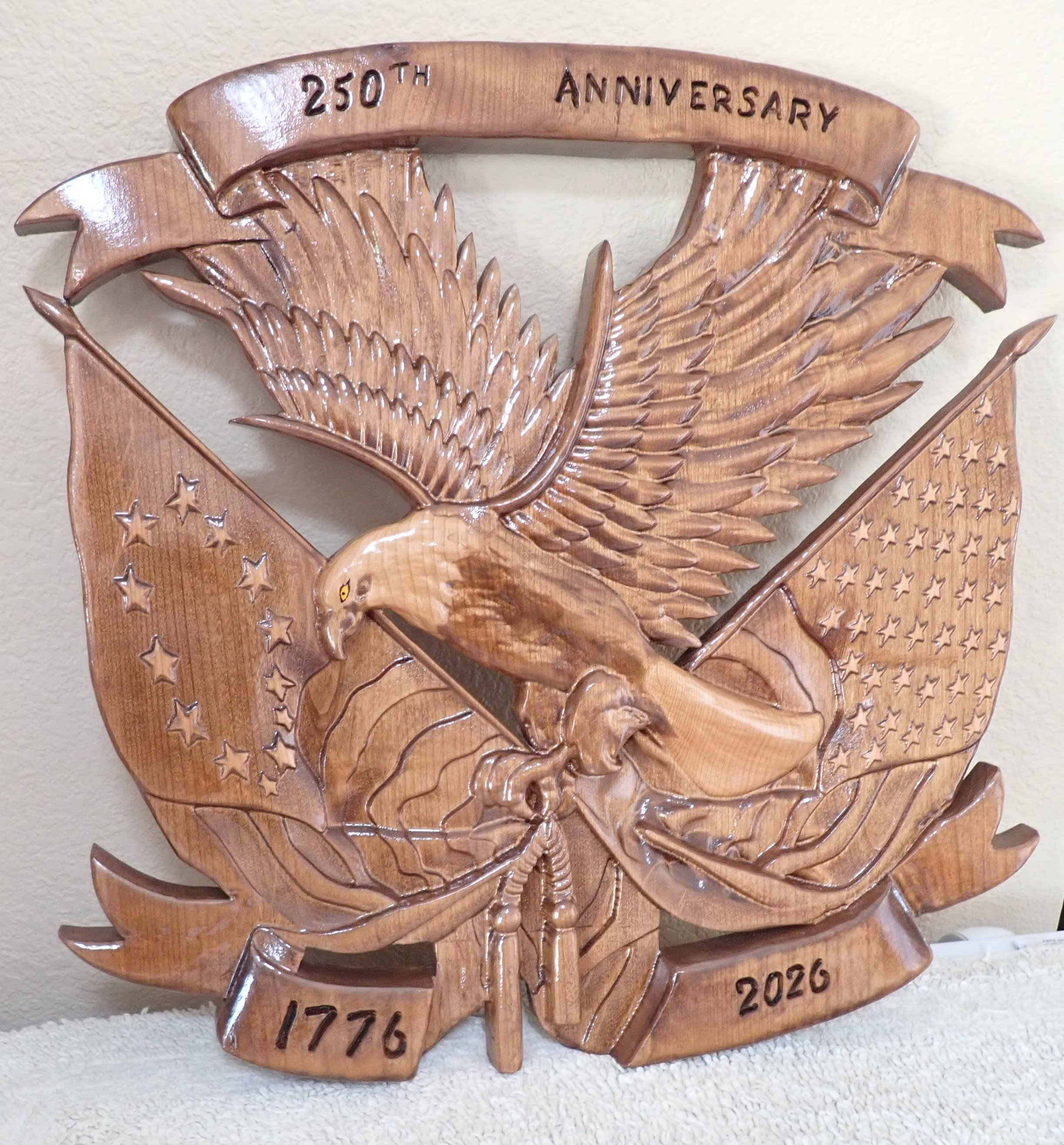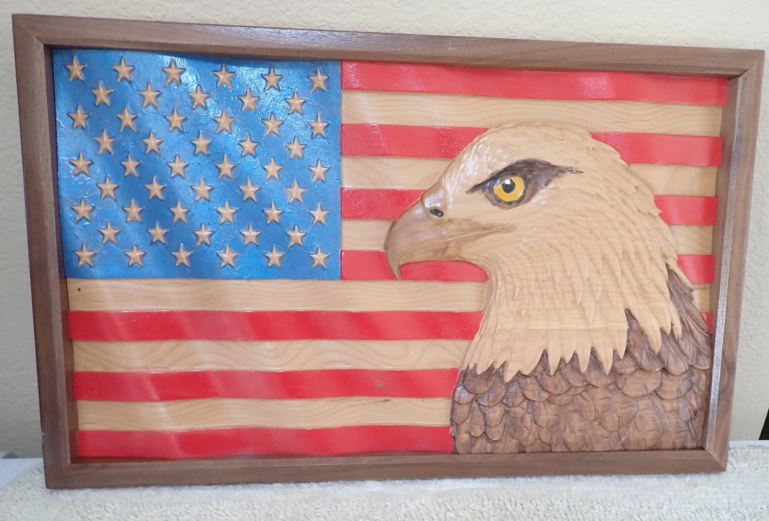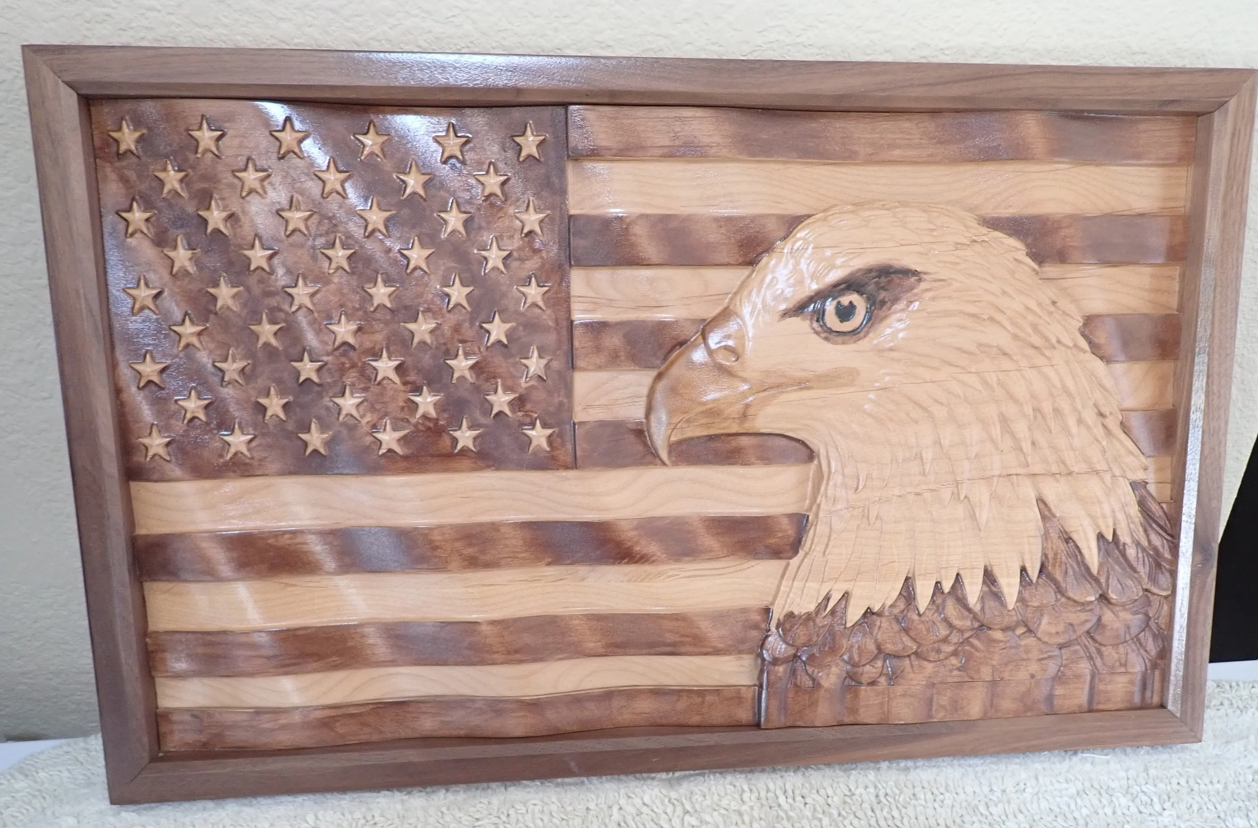 Decorative eagle and American flag wall art with carved details.